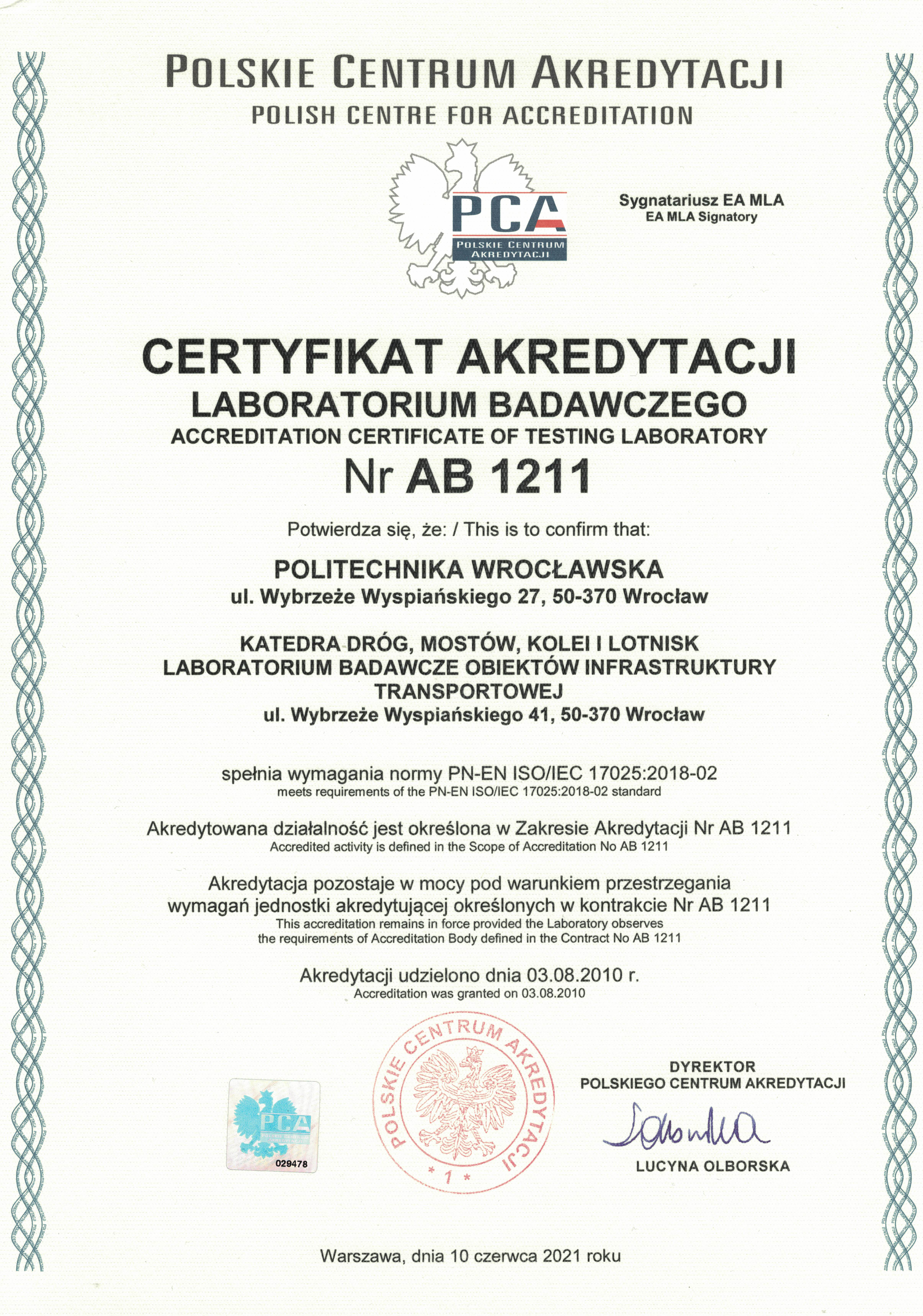 Laboratorium Badawcze Obiektów Infrastruktury Transportowej posiada obecnie Pracownię Drogową.